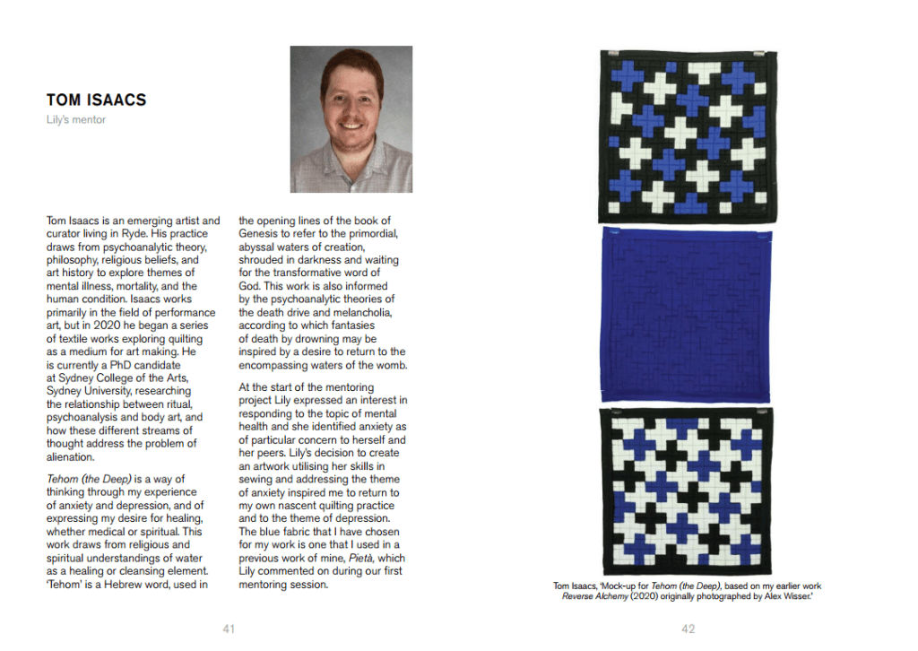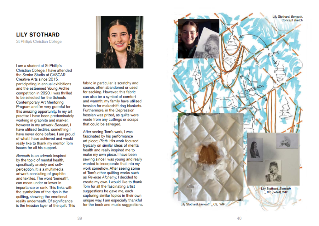 For the past few months I have had the distinct pleasure of being a participating artist mentor as part of the School Contemporary Arts Mentoring Program (SCAMP), coordinated by Merryn Hull PhD and supported by CreateNSW. My fellow artist mentors and I have been meeting regularly (over Zoom) with our student mentees from high schools in the Cessnock region with the aim of putting together a joint exhibition called ‘Cessnock Contemporary’. Covid restrictions in NSW have made it difficult for both mentors and mentees and have led to the postponement of the exhibition until December, but I am very excited to share with you the online catalogue which documents our progress towards the final exhibition. I am incredibly proud of my mentee Lily and all the hard work she has put into this project. She’s a talented and dedicated young woman and I can’t wait to see her finished work in December and congratulate her in person.