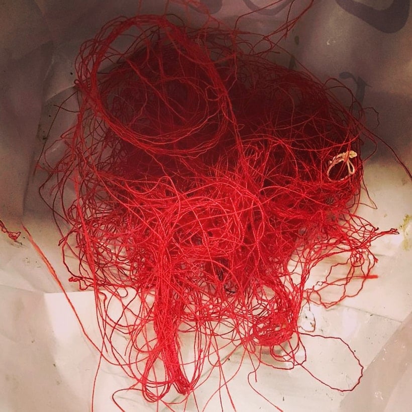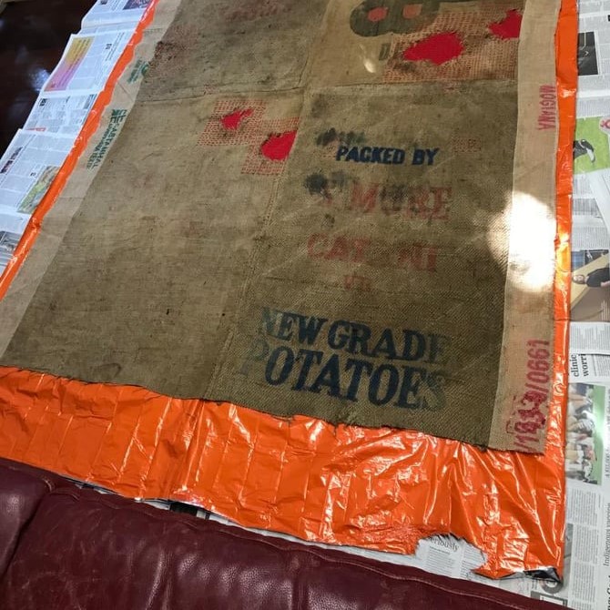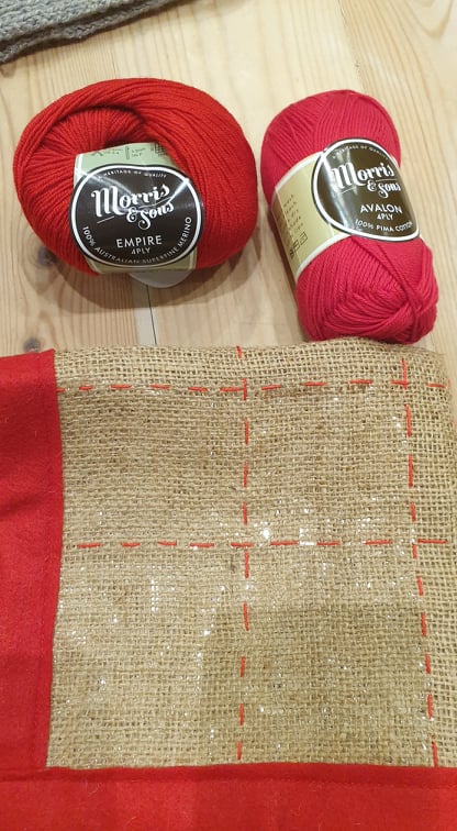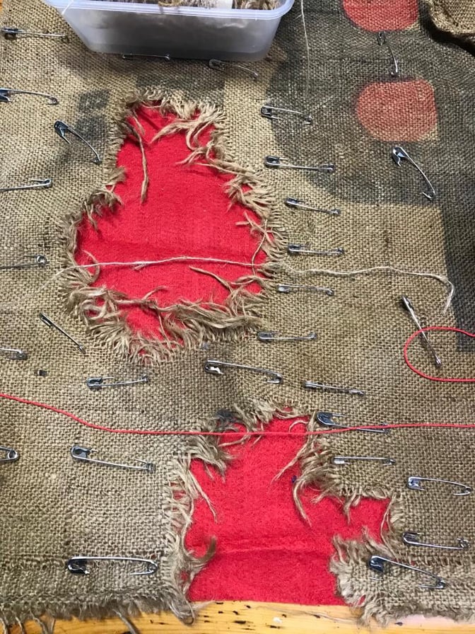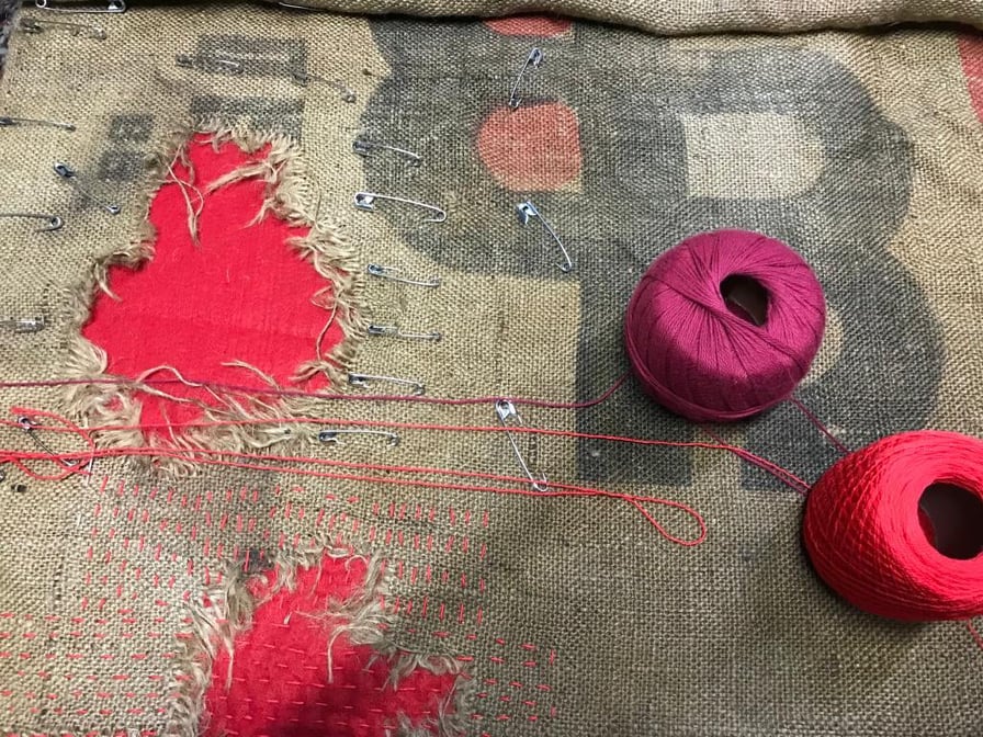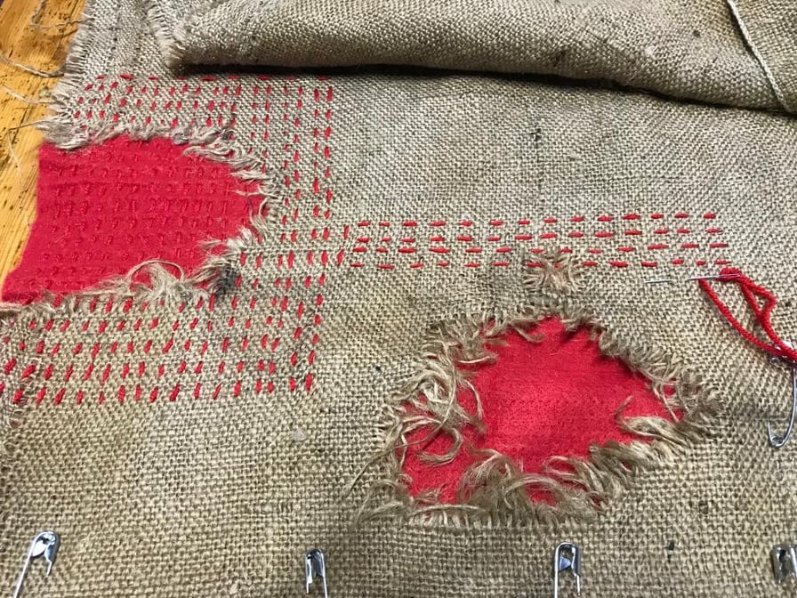 The first difficulty we ran into with the creation of the wagga was a relatively minor quibble about the colour of thread. The hessian from my late grandfather’s estate is old and had a number of holes which we planned to patch with red felt. My mum suggested we use a Japanese mending technique called boro. When she showed me what it looked like I was really pleased with the effect, but not as pleased with the colour of the thread. We tried a few different colours before we settled on a woolen thread that was perfect: