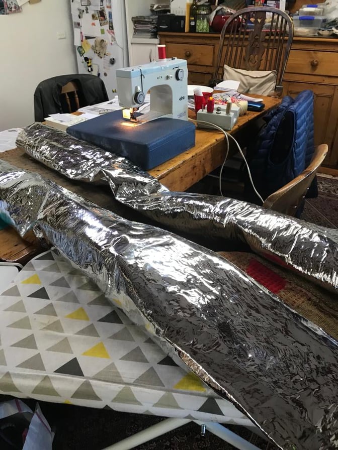 This led to the third and final difficulty, which (thankfully) was relatively minor in the scheme of things. Before the ill-fated first attempt to sew the mylar to the hessian we had discussed different ways to remove the folds from the mylar. The most-effective way, it turned out, was to use an iron. We discovered, however, that this did not work so well with the new mylar! Luckily the new mylar blanket was much bigger than the old mylar blanket and we were able to trim off the melted section: