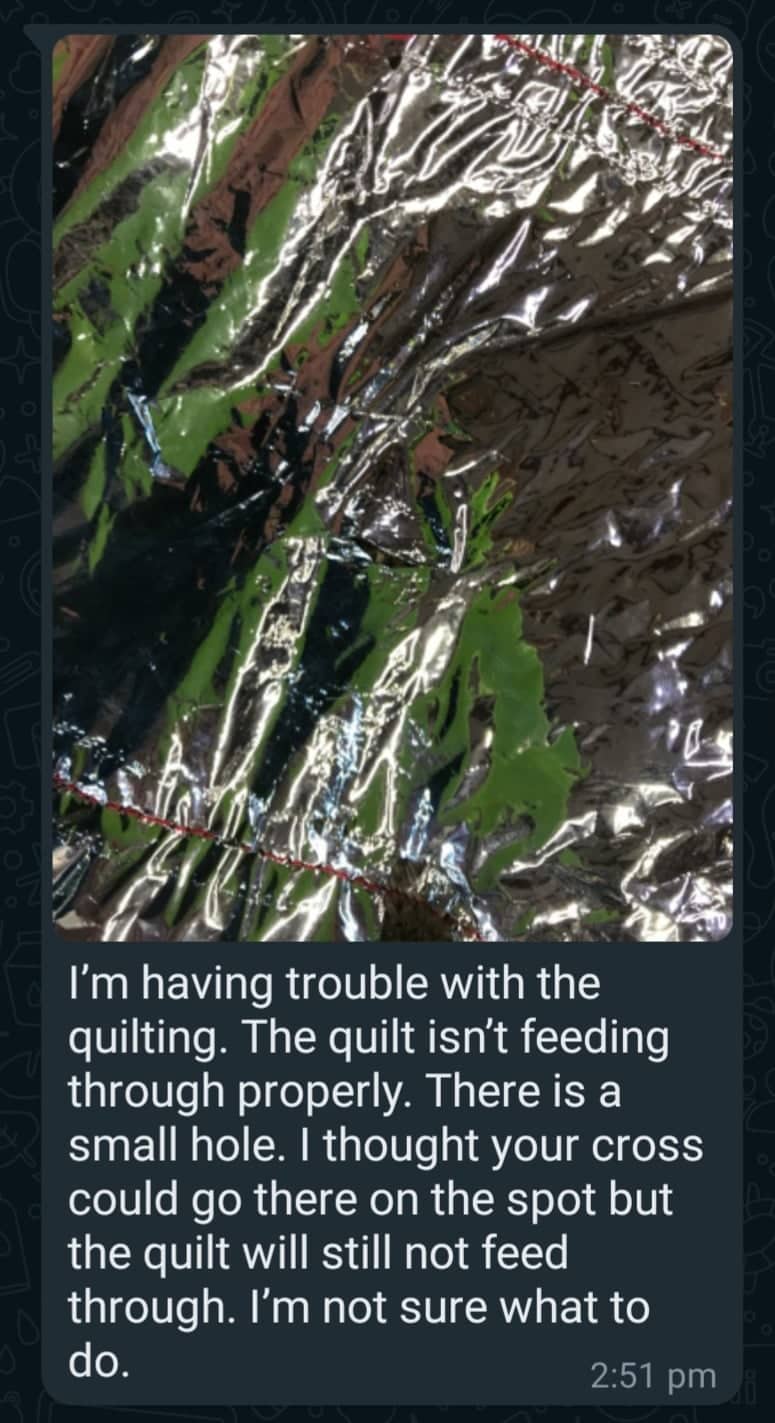 The second difficulty that we ran into was a bit more serious. Despite making two test quilts with hessian and mylar, we hadn’t accounted for the different size and weight of the wagga and how this would affect the mylar backing. Despite Mum’s best efforts, the mylar wouldn’t feed through the sewing machine properly and eventually it started shredding. In the end Mum had to remove all the stitching and we started again with a different type of mylar: