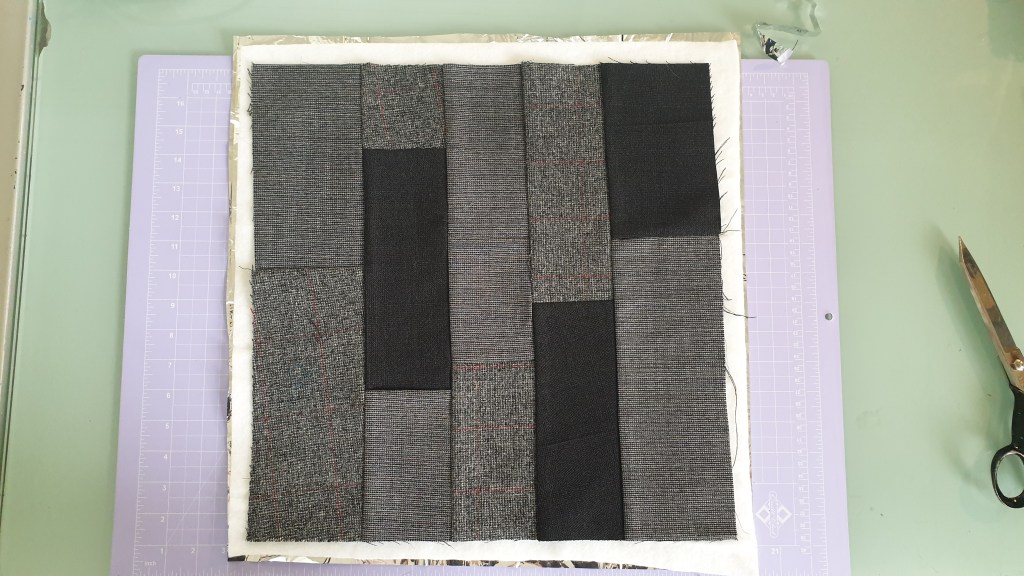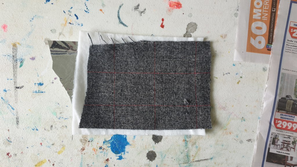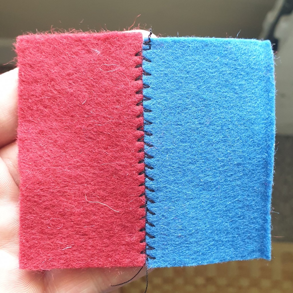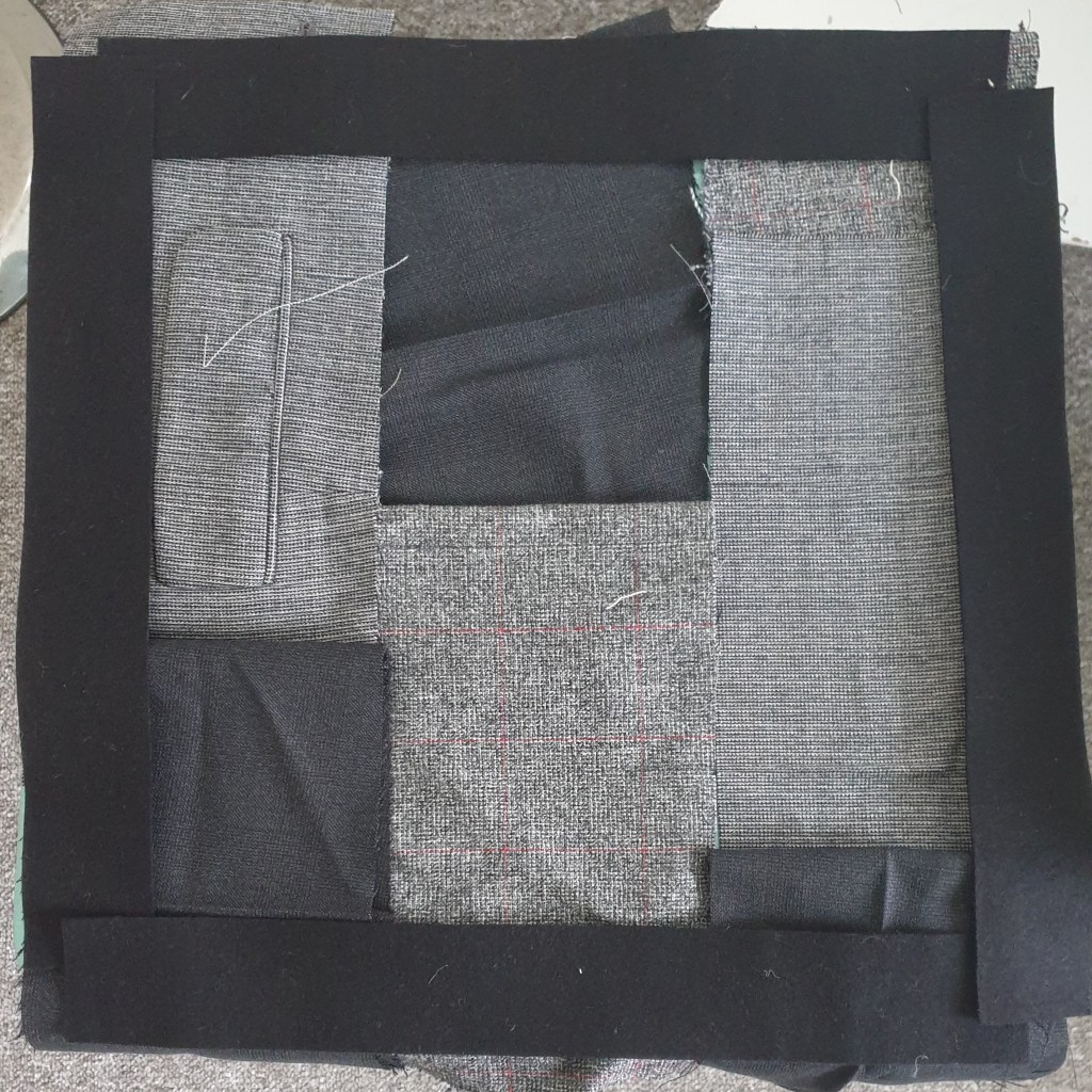 During this process I also started to experiment with designs for the third Emergency Blanket. This one will be made from leftover felt from previous art projects. At the moment the design won’t be based on any traditional quilting patterns, but will loosely mirror the haphazard layout of so-called ‘domestic waggas’. We experimented with a few different faggoting stitches and settled on one that we will use for the next Emergency Blanket.