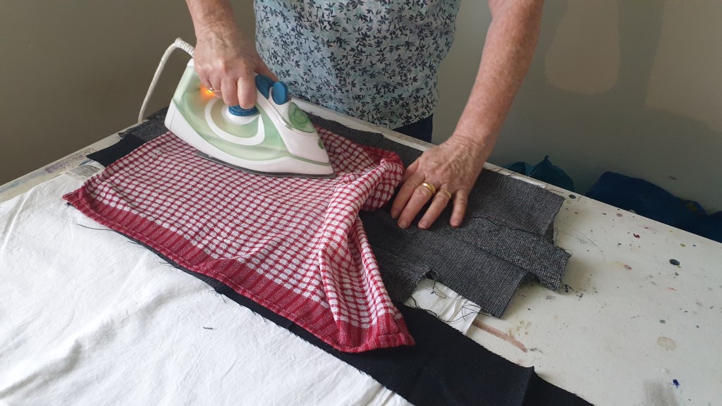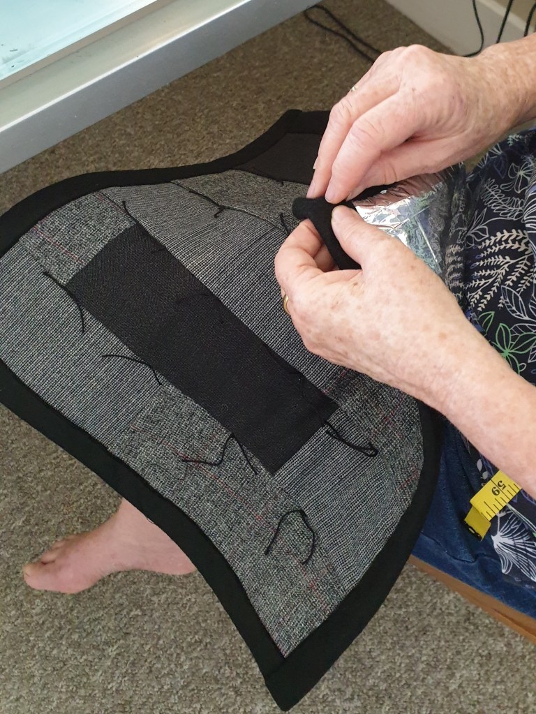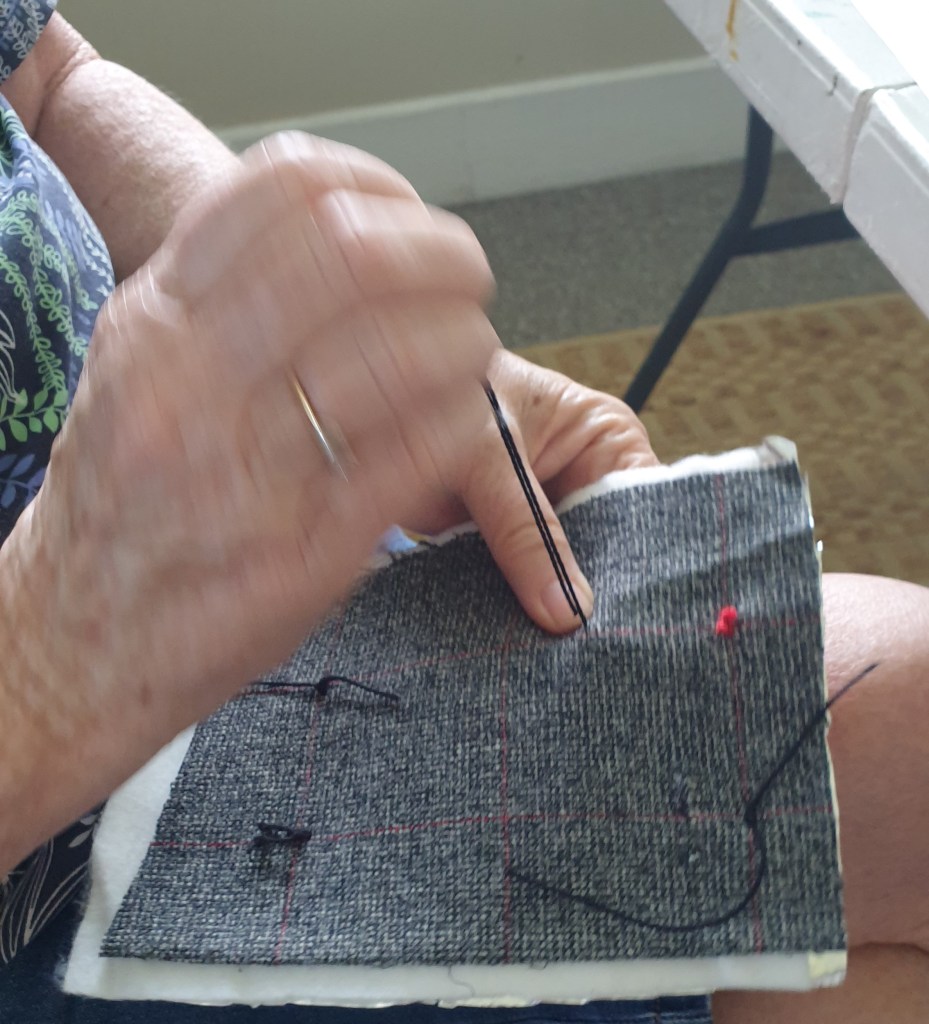 My partner and I recently travelled up to Kandos with our son to stay at the beautiful Cloudbough Art Residency run by Gabrielle Bates. We were joined during the residency by my Mum and Dad. Before we left, my partner and I each took a rapid antigen test to make sure we were Covid negative. On the way to Kandos we stopped to pick up some black 4ply crochet thread. Mum and I planned to use the crochet thread to experiment with a tying technique that we are considering using for the second Emergency Blanket. This tying technique is an alternative method for joining the layers of a quilt or wagga together.