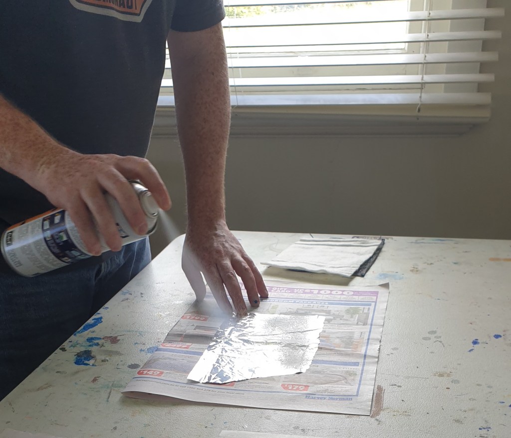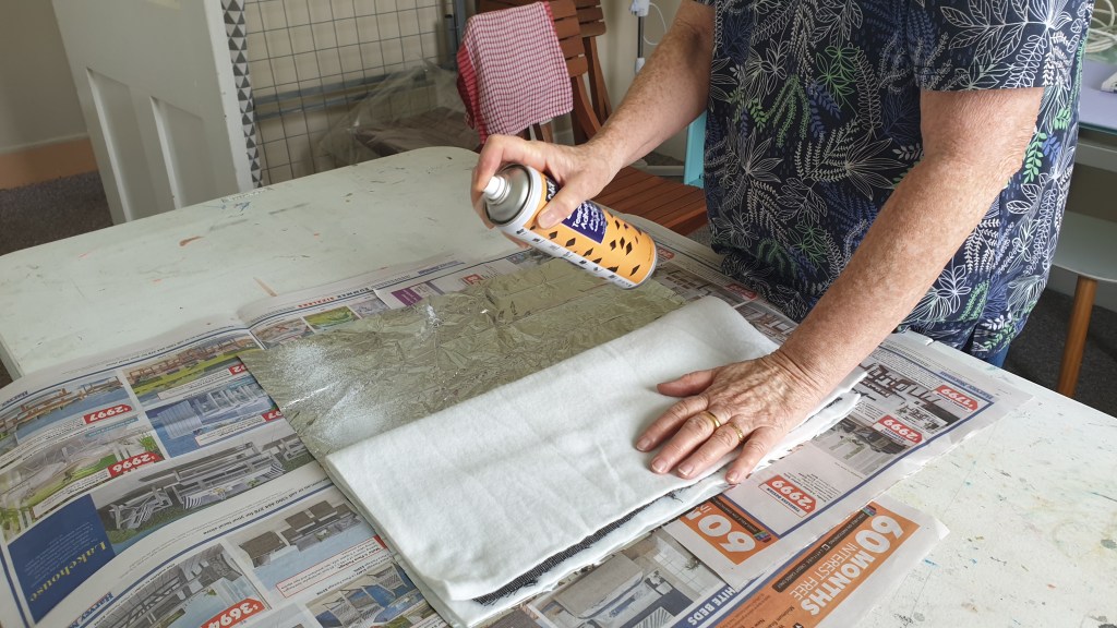 At Cloudbough, Mum and I got started on a test quilt for the second Emergency Blanket using leftover material, some wadding to give it a little more body, and some leftover mylar from the previous test quilts. Before we could tie the layers together we had to iron out the creases and flatten the seams. Then we had to spray the layers with basting spray so that it would stick together while we were tying.