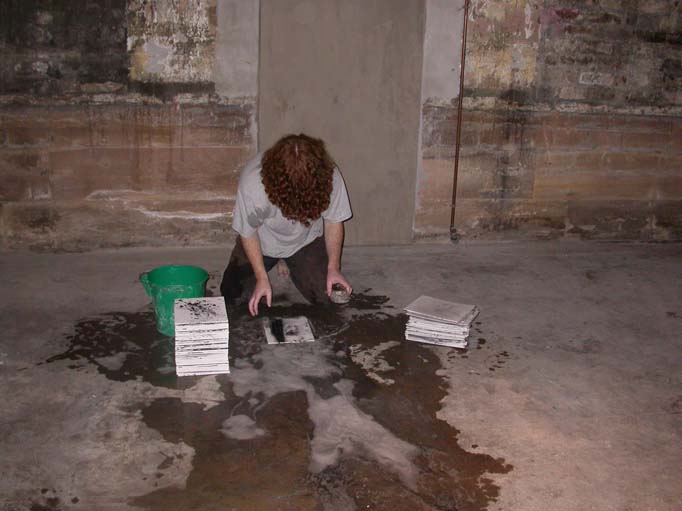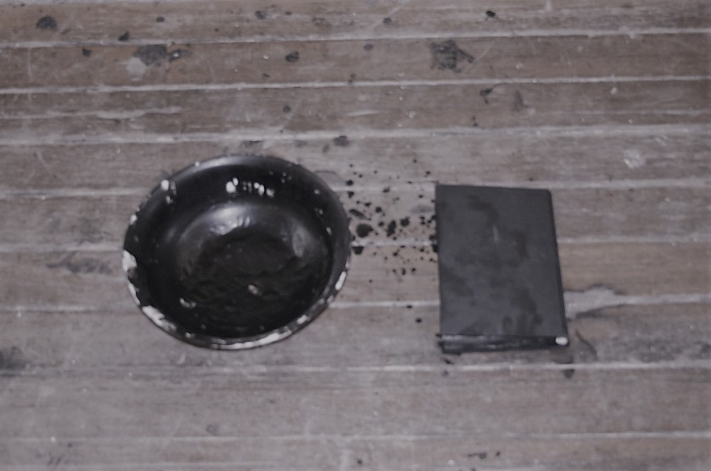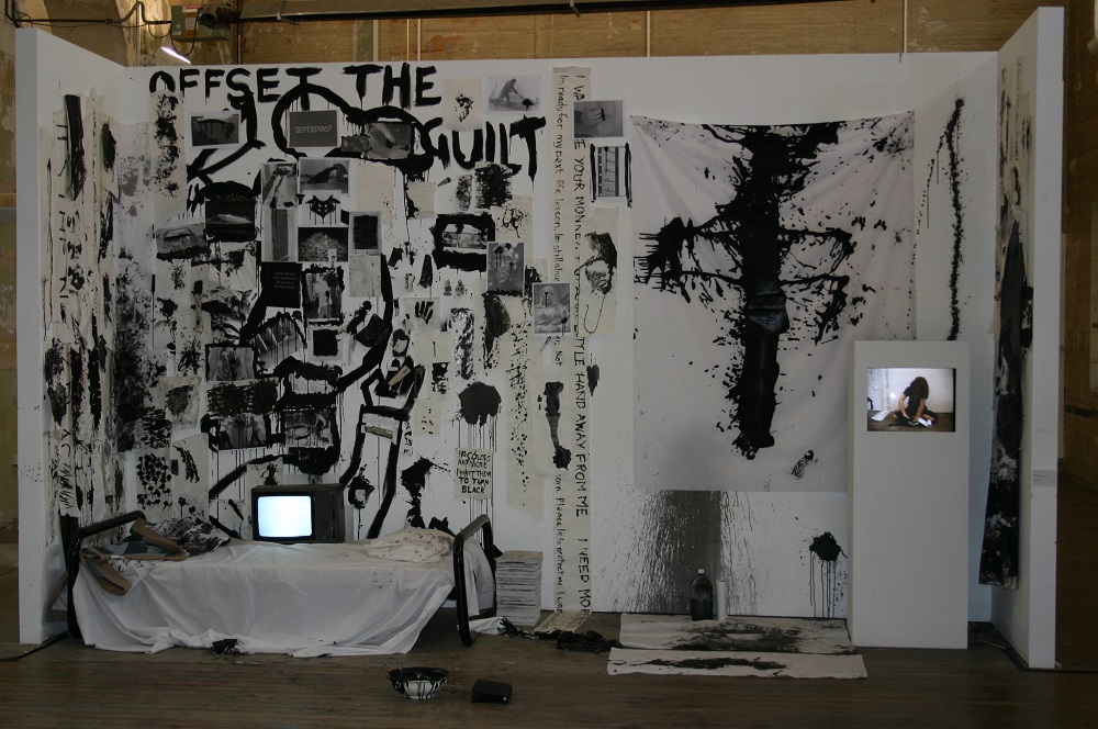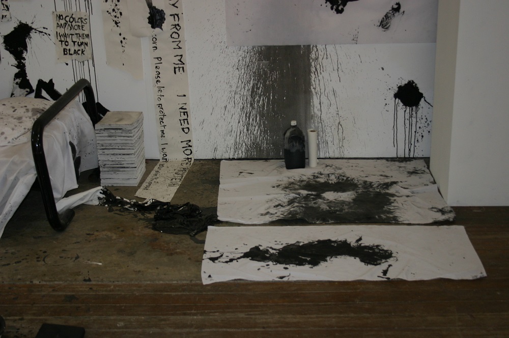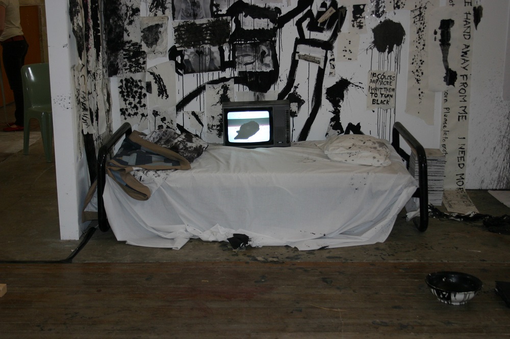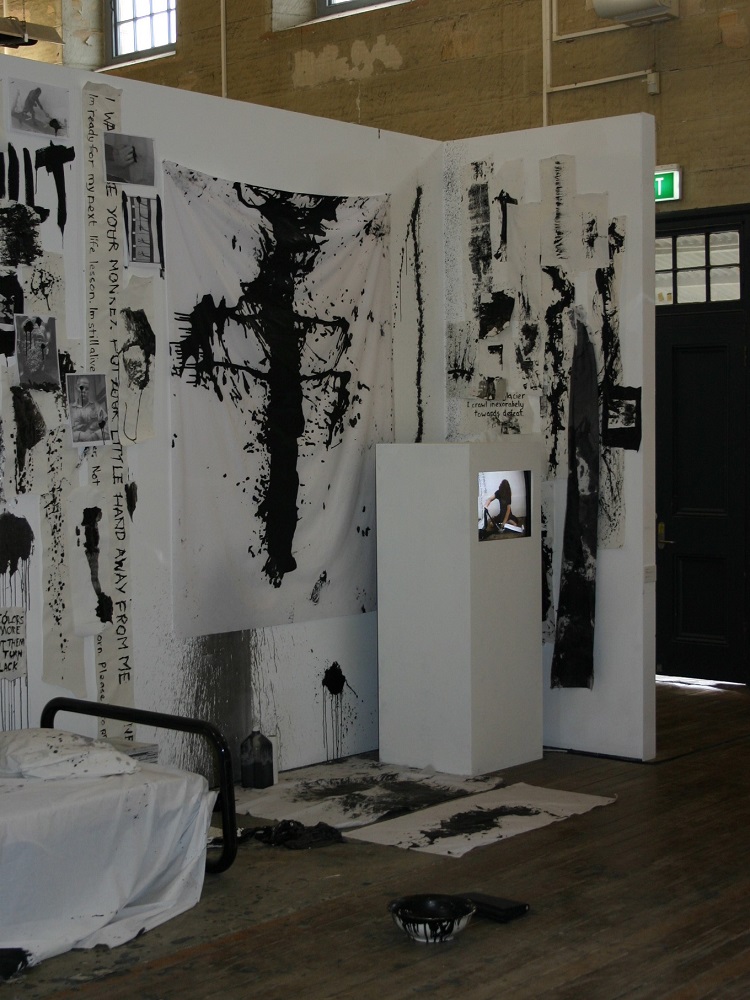 Out the front of the installation there is a black book and a white bowl marked with black paint which are physical remains from my performance Black Book (2006). On the opening night of the Undergraduate Degree Show I sat cross legged on the floor with a bowl full of black paint and a blank book in front of me. Over the course of an hour I painted each page of the book black with my hand.