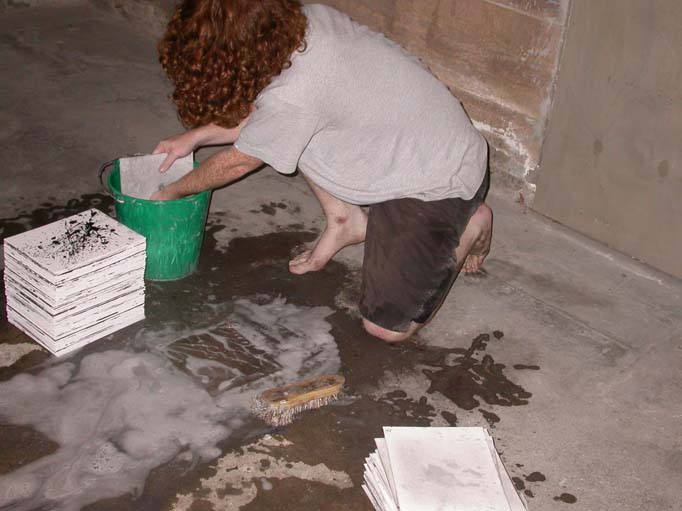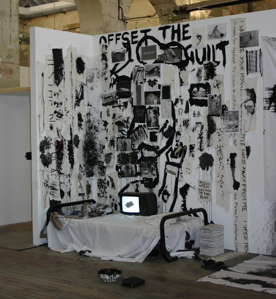 At the foot of the bed a stack of canvas boards are physical remains from a performance titled Scrubbing (2006). Over the course of 2006 I painted a series of one hundred abstract paintings using black paint on white canvas boards. When the paintings were finished I did a performance where I attempted to scrub them all clean.