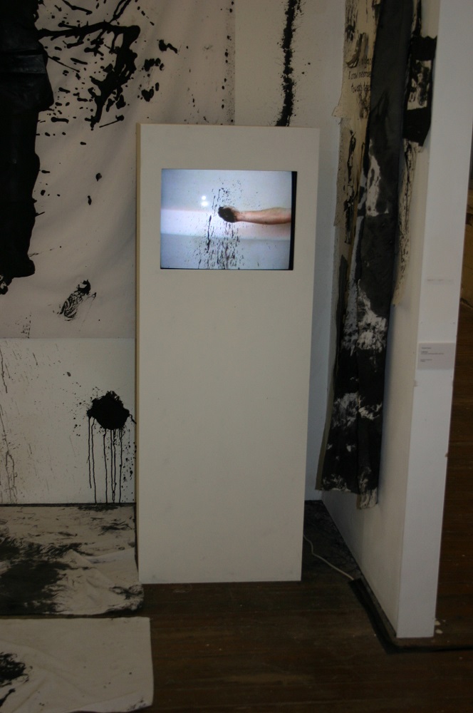 The video screen in this installation shows documentation from three performances. For the first performance Catching Paint (2006), I attempted to catch black paint with my hand as it was poured and dripped from above in a parody of Richard Serra’s Catching Lead. In the second performance Paint Head (2006), my head was covered by a sheet of white fabric and my arms were wet with black paint. I tried to wipe as much paint from my hands onto the sheet as I could. In the third performance Intestines (2006), I pulled a roll of paper through a bowl of black paint until the paint ran out and the paper broke.