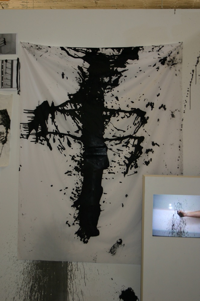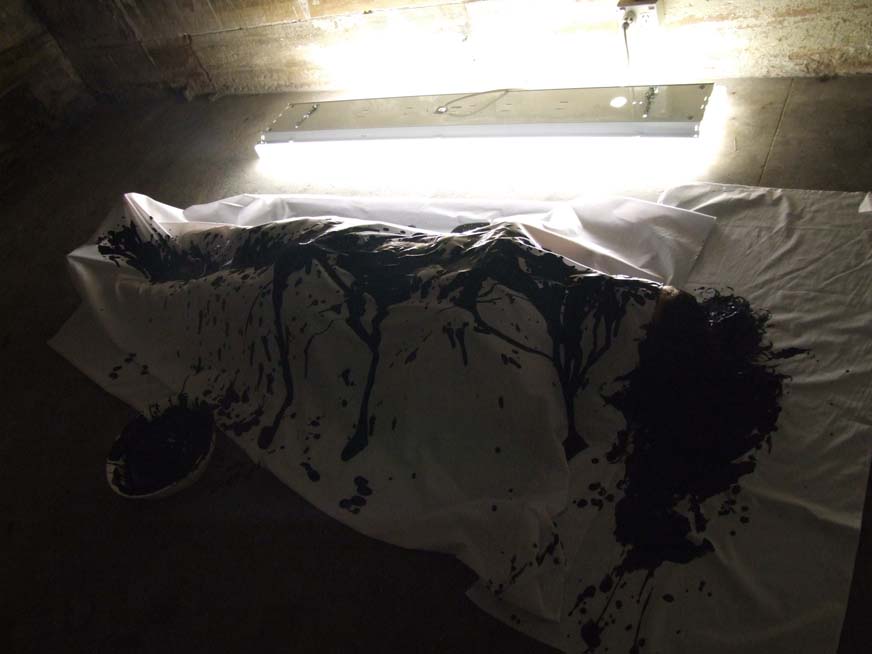 On the right hand side of the installation there are physical remains from my performance Shroud (2006). For this performance I lay on the ground with a sheet laid over me and a second piece of fabric under my head. The performance began with Sach Catts massaging black paint into my long hair. When my hair was completely soaked in black paint Sach dripped the remaining paint over my body from his cupped hands.