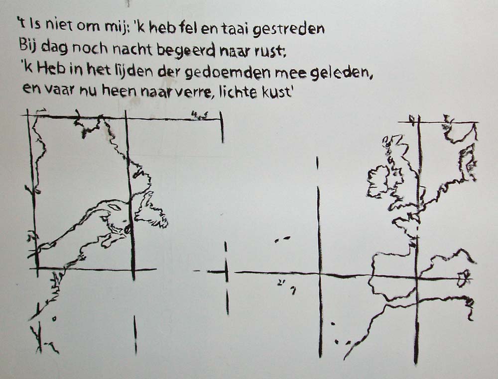Hans/Icare consists of two fragmented maps accompanied by passages of text, painted side by side on the gallery wall. The first map is of the Atlantic Ocean with Cape Cod, America on the left, the Azores in the middle and Groningen in the Netherlands on the right. The Dutch artist Bas Jan Ader drowned in the Atlantic attempting a solo crossing as part of a performance titled In Search of the Miraculous. Above the Atlantic Ocean is a Dutch poem written by Ader’s father. The second map is of Ancient Greece with the island of Crete at the bottom left. Delos, Paros, Samos, Lebinthos, Calymne and Icaria are all present as mentioned in Ovid’s recount of Icarus’ flight. Above the Icarian Sea there is an excerpt from Ovid’s description of the death of Icarus.