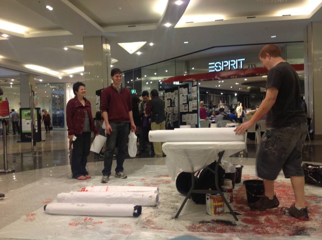 For this performance I dipped my hand into paint and then allowed the paint to drip onto the canvas below. Periodically I would roll up the scroll at one end, covering up the paint, and unroll at the other end, revealing fresh paper, before resuming the drip painting. Over the course of the performance I created four scrolls, each with a different colour of paint. I started with black paint, followed by white, then red and finally gold.