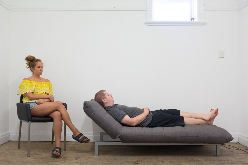 In 2018 I participated in ‘Holding Space’ curated by Danica Knezevic, the third and final of The Kiosk 3×6 Projects organised by Modern Art Projects Blue Mountains at The Kiosk Studio in Katoomba. For this performance I lay asleep on the couch while audience members took turns sitting beside me. Video documentation of the performance was also exhibited as part of ‘Holding Space’ alongside the couch and chair used in the performance.