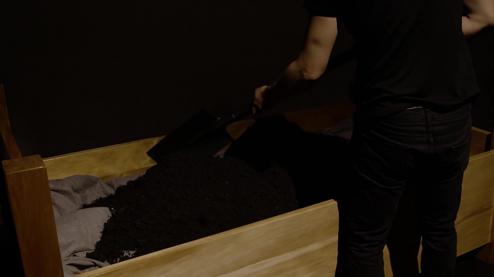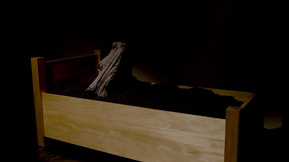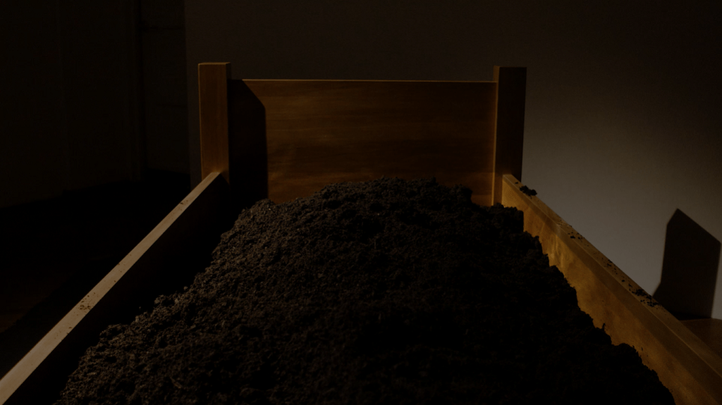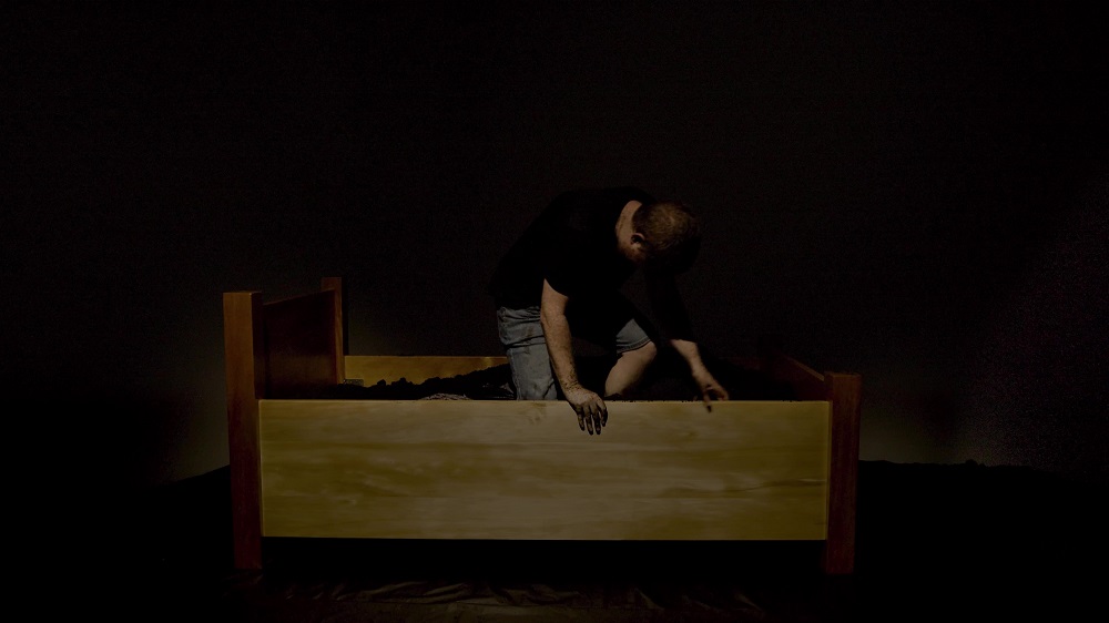 For Night Soil (2022) I was buried alive inside a purpose-built wooden bed. Video documentation of this performance was exhibited alongside the soil-filled bed as part of my PhD examination exhibition, ‘Sacrificial Bodies’.