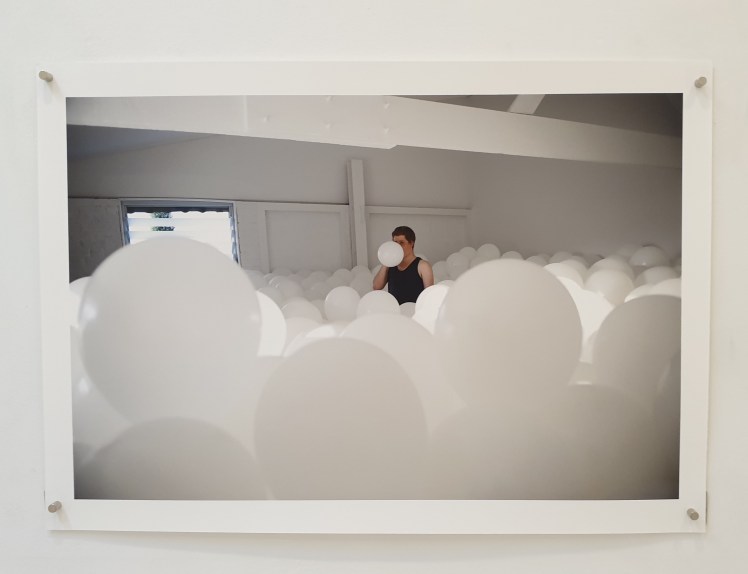 “In addition to making something visible, the original performance of Ruach took something ephemeral—breath, duration, performance—and made it physical and enduring (although not permanent). The balloons were, in effect, a form of documentation, albeit a temporary one (as I suppose all human attempts at documentation are likely to be on the grandest time scale). If I had kept the popped and deflated balloons from the performance I could have exhibited them as an indexical document. In their place I have chosen to exhibit the leftover unused balloons which remained at the end of the three day period. Alongside these artefacts I have selected one photograph of the performance by my good friend Alex Wisser.”