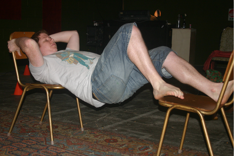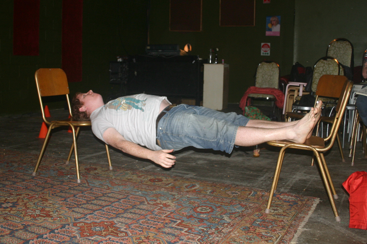 As part of the base-metal event, Intercessions #3 at 107 Projects in Redfern, I performed a short endurance piece. I attempted to maintain a horizontal posture for as long as possible while balanced between two chairs.